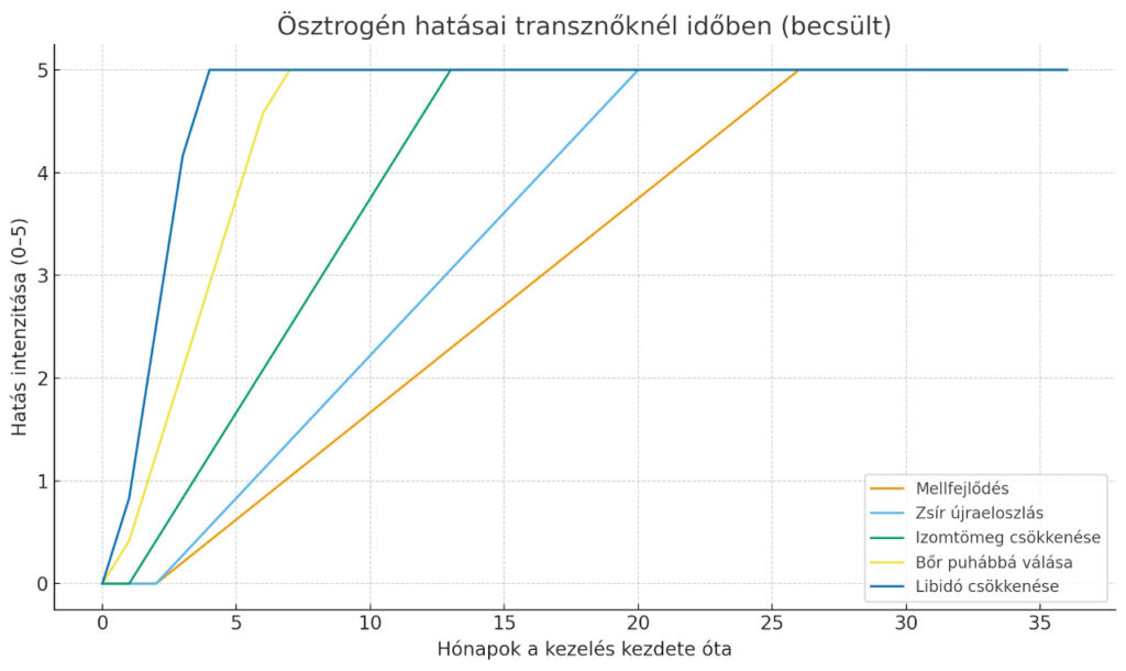 Az ösztrogén hatása a transznőkre több szinten érvényesül, de fontos tudni, hogy a változások mértéke és sebessége egyénenként eltérhet, és hónapok–évek alatt zajlik le. Megkezdődik a mellfejlődés – a mirigyállomány nő, a mellbimbó érzékenyebb lehet. A végső méret genetikai adottságoktól is függ, általában kisebb, mint cisznemű nőknél. A Zsír újraeloszlását okozza a testben – a zsír inkább a csípőre, combra, fenékre rakódik, kevésbé a hasra. A bőr puhább, vékonyabb, kevésbé zsíros lesz. A test- és arcszőrzet lassabban nő, kissé elvékonyodhat, de teljesen ritkán tűnik el. A meglévő arcszőrzet eltávolításához lézer/elektrolízis kell. Az izomtömeg csökken, főleg a felsőtestben; az izomerő is mérséklődik. Herék mérete csökken, a spermaképződés leállhat. A libidó gyakran csökken, az erekció gyengülhet.